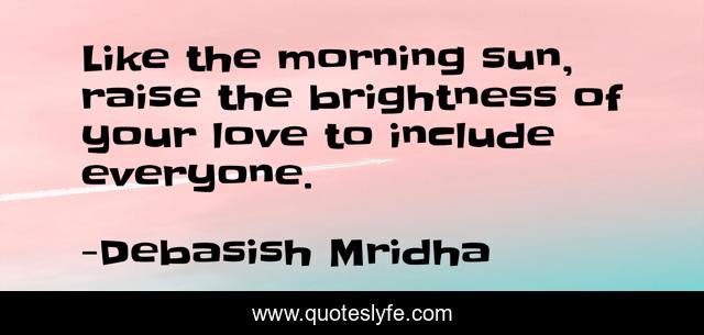 This page presents the quote "Like the morning sun, raise the brightness of your love to include everyone.". Author of this quote is Debasish Mridha. This quote is about philosophy, brightness-of-your-love, debasish-mridha, quotes, include-everyone, debasish-mridha-md, inspirational, enthusiasm, like-the-morning-sun,.