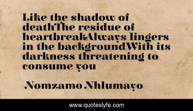 This page presents the quote "Like the shadow of deathThe residue of heartbreakAlways lingers in the backgroundWith its darkness threatening to consume you". Author of this quote is Nomzamo Nhlumayo. This quote is about loss, pain, hurt, sadness, anger, fear, depression,.