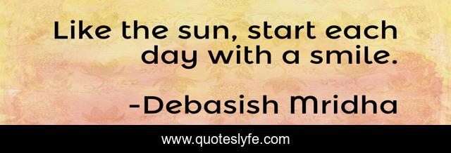 This page presents the quote "Like the sun, start each day with a smile.". Author of this quote is Debasish Mridha. This quote is about power-of-a-smile, philosophy, debasish-mridha, quotes, smile, inspirational, start-each-day, enthusiasm, debasish-mridha-m-d,.