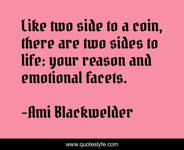 This page presents the quote "Like two side to a coin, there are two sides to life: your reason and emotional facets.". Author of this quote is Ami Blackwelder. This quote is about emotion, life, coins, reason,.