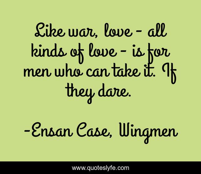 This page presents the quote "Like war, love - all kinds of love - is for men who can take it. If they dare.". Author of this quote is Ensan Case, Wingmen. This quote is about love, war, affection,.