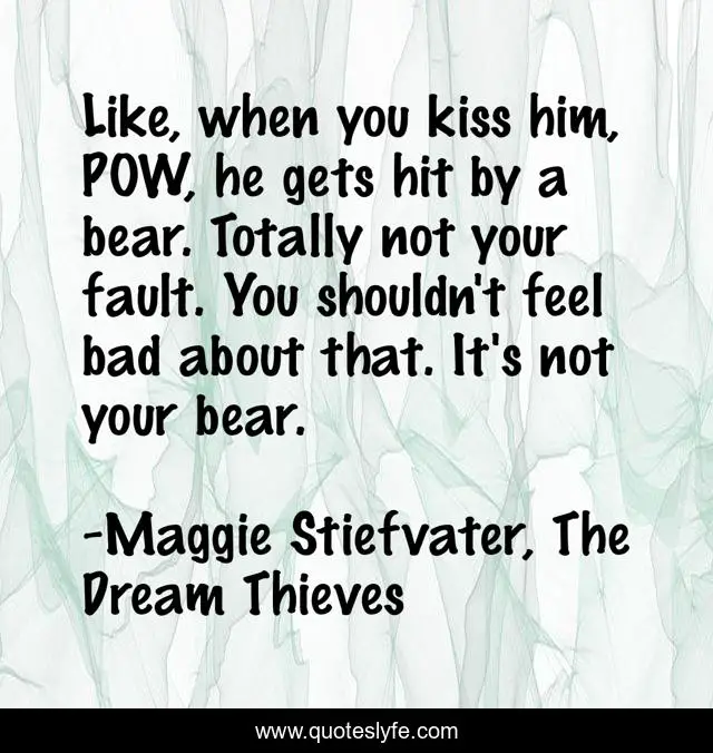 This page presents the quote "Like, when you kiss him, POW, he gets hit by a bear. Totally not your fault. You shouldn't feel bad about that. It's not your bear.". Author of this quote is Maggie Stiefvater, The Dream Thieves. This quote is about bears, funny, comedy, kiss,.