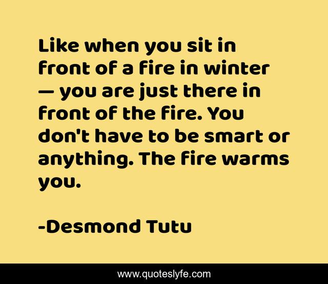This page presents the quote "Like when you sit in front of a fire in winter — you are just there in front of the fire. You don't have to be smart or anything. The fire warms you.". Author of this quote is Desmond Tutu. This quote is about god, theology, religion, communion, god-s-will, god-s-love,.