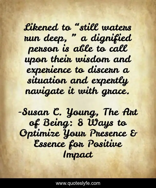 This page presents the quote "Likened to “still waters run deep, ” a dignified person is able to call upon their wisdom and experience to discern a situation and expertly navigate it with grace.". Author of this quote is Susan C. Young, The Art of Being: 8 Ways to Optimize Your Presence & Essence for Positive Impact. This quote is about dignity, self-confidence, susan-young, relationship, communication-skills, communication, first-impressions, motivational-speaker, grace,.