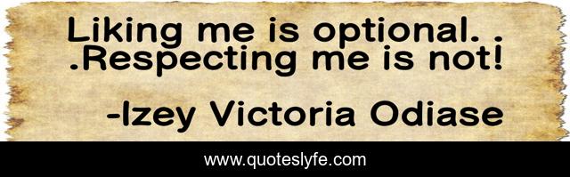 This page presents the quote "Liking me is optional. . .Respecting me is not!". Author of this quote is Izey Victoria Odiase. This quote is about respecting-others, respectful, respect-others, respected, courtesy, respecting-yourself, respect-yourself, respect,.