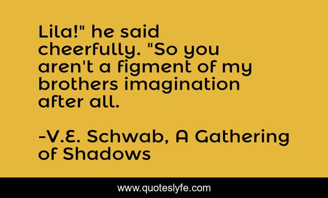 This page presents the quote "Lila!" he said cheerfully. "So you aren't a figment of my brothers imagination after all.". Author of this quote is V.E. Schwab, A Gathering of Shadows. This quote is about funny, comedy, brothers, imagination,.