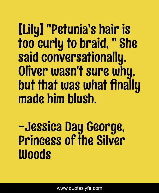 This page presents the quote "[Lily] "Petunia's hair is too curly to braid, " She said conversationally. Oliver wasn't sure why, but that was what finally made him blush.". Author of this quote is Jessica Day George, Princess of the Silver Woods. This quote is about cute, oliver, shy, blushing, petunia, lily,.
