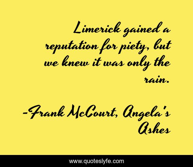 This page presents the quote "Limerick gained a reputation for piety, but we knew it was only the rain.". Author of this quote is Frank McCourt, Angela's Ashes. This quote is about piety, limerick, rain, religion, angela-s-ashes, ireland,.