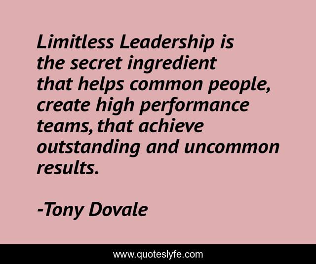 This page presents the quote "Limitless Leadership is the secret ingredient that helps common people, create high performance teams, that achieve outstanding and uncommon results.". Author of this quote is Tony Dovale. This quote is about courageous-mindsets, swift-success, creativity, tony-dovale, leadership, innovation, lifemasters, revolutionary-workplace, staff-engagement,.