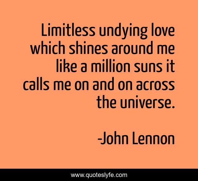 This page presents the quote "Limitless undying love which shines around me like a million suns it calls me on and on across the universe.". Author of this quote is John Lennon. This quote is about sun, beatles, love, affection, universe,.