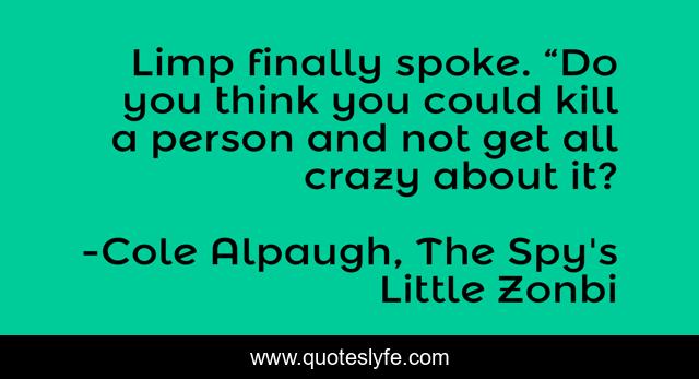 This page presents the quote "Limp finally spoke. “Do you think you could kill a person and not get all crazy about it?". Author of this quote is Cole Alpaugh, The Spy's Little Zonbi. This quote is about spy, novel, fiction, literary, suspense, espionage, thriller,.
