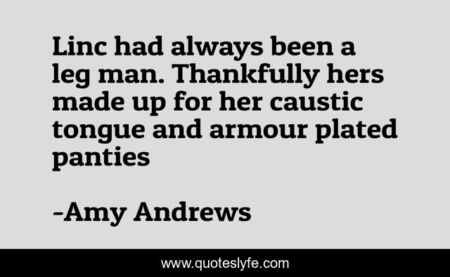 This page presents the quote "Linc had always been a leg man. Thankfully hers made up for her caustic tongue and armour plated panties". Author of this quote is Amy Andrews. This quote is about rugby, amy-andrews, brazen, quotes, hot-rugby-dudes, playing-the-player, sydney-smoke-rugby-series,.