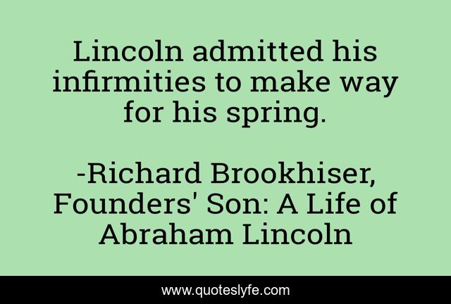 This page presents the quote "Lincoln admitted his infirmities to make way for his spring.". Author of this quote is Richard Brookhiser, Founders' Son: A Life of Abraham Lincoln. This quote is about humility, honesty, rapport,.