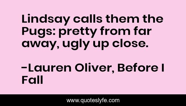 This page presents the quote "Lindsay calls them the Pugs: pretty from far away, ugly up close.". Author of this quote is Lauren Oliver, Before I Fall. This quote is about funny, comedy,.