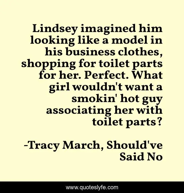 This page presents the quote "Lindsey imagined him looking like a model in his business clothes, shopping for toilet parts for her. Perfect. What girl wouldn't want a smokin' hot guy associating her with toilet parts?". Author of this quote is Tracy March, Should've Said No. This quote is about small-town-romance, contemporary-romance, cowboy-romance,.