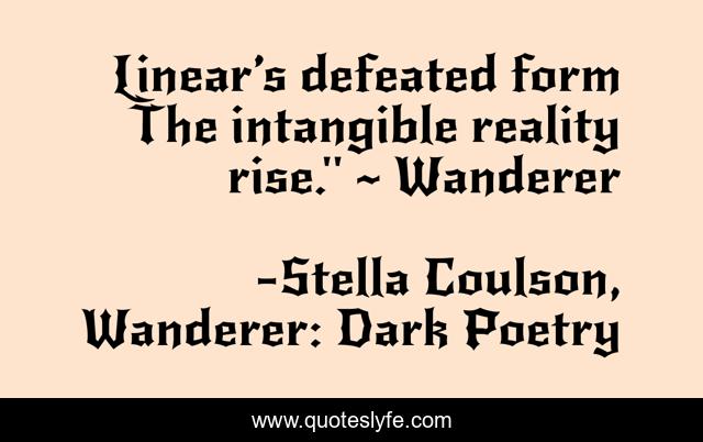 This page presents the quote "Linear’s defeated form The intangible reality rise.'' ~ Wanderer". Author of this quote is Stella Coulson, Wanderer: Dark Poetry. This quote is about dark-poetry, abstract, time-travel, poem, surreal,.