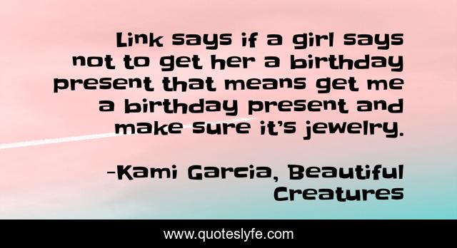 This page presents the quote "Link says if a girl says not to get her a birthday present that means get me a birthday present and make sure it’s jewelry.". Author of this quote is Kami Garcia, Beautiful Creatures. This quote is about gift, birthday, jewelry, present,.