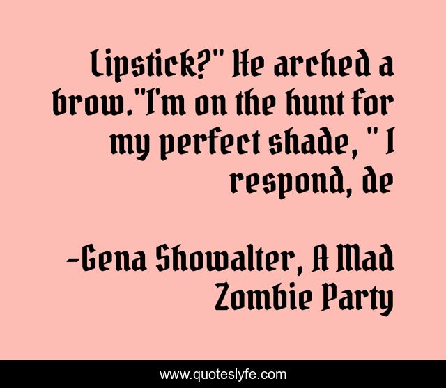 This page presents the quote "Lipstick?" He arched a brow."I'm on the hunt for my perfect shade, " I respond, de". Author of this quote is Gena Showalter, A Mad Zombie Party. This quote is about funny, humour, sad, witty-banter, funny-but-sad, comedy,.