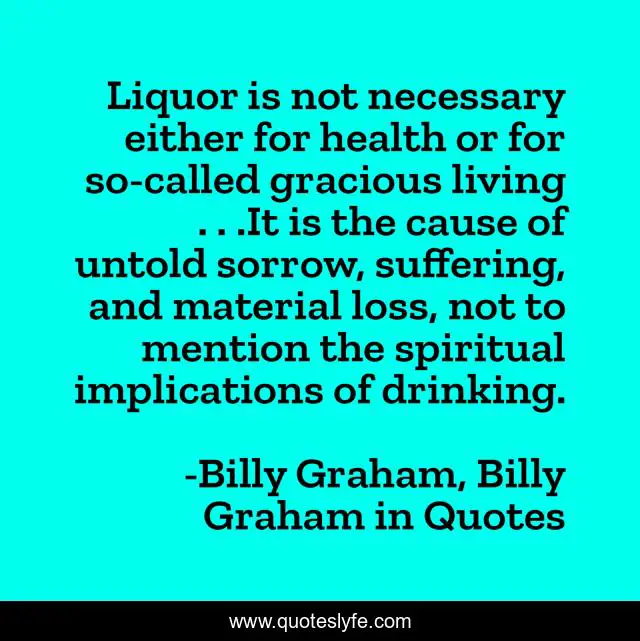 This page presents the quote "Liquor is not necessary either for health or for so-called gracious living . . .It is the cause of untold sorrow, suffering, and material loss, not to mention the spiritual implications of drinking.". Author of this quote is Billy Graham, Billy Graham in Quotes. This quote is about addiction, alcohol, liquor, billy-graham,.