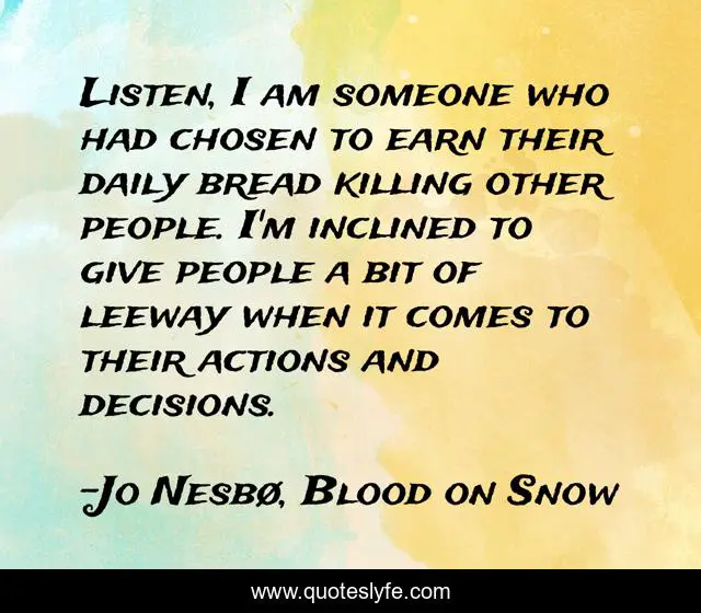 This page presents the quote "Listen, I am someone who had chosen to earn their daily bread killing other people. I'm inclined to give people a bit of leeway when it comes to their actions and decisions.". Author of this quote is Jo Nesbø, Blood on Snow. This quote is about chances, judgement,.