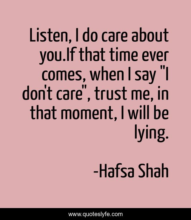 This page presents the quote "Listen, I do care about you.If that time ever comes, when I say "I don't care", trust me, in that moment, I will be lying.". Author of this quote is Hafsa Shah. This quote is about caring, caring-for-others, love, love-and-sayings, affection,.