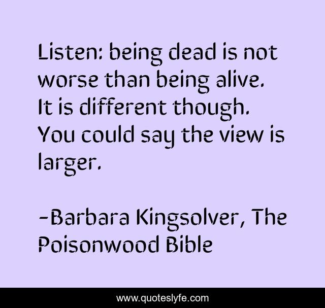 This page presents the quote "Listen: being dead is not worse than being alive. It is different though. You could say the view is larger.". Author of this quote is Barbara Kingsolver, The Poisonwood Bible. This quote is about life, death,.