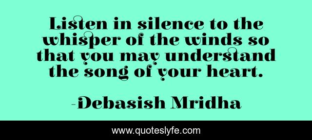 This page presents the quote "Listen in silence to the whisper of the winds so that you may understand the song of your heart.". Author of this quote is Debasish Mridha. This quote is about song-of-your-heart, philosophy, debasish-mridha, whisper-of-the-winds, quotes, inspirational, listen-in-silence, enthusiasm, debasish-mridha-m-d,.
