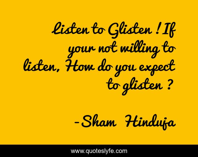 This page presents the quote "Listen to Glisten !If your not willing to listen, How do you expect to glisten ?". Author of this quote is Sham Hinduja. This quote is about positive, confidence, motivational, self-improvement, optimistic,.