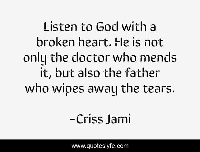 This page presents the quote "Listen to God with a broken heart. He is not only the doctor who mends it, but also the father who wipes away the tears.". Author of this quote is Criss Jami. This quote is about heart, pain, recovery, doctor, god, crying, father, hurt, heavenly-father,.