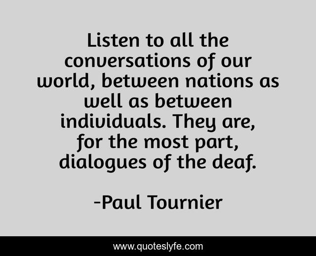 This page presents the quote "Listen to all the conversations of our world, between nations as well as between individuals. They are, for the most part, dialogues of the deaf.". Author of this quote is Paul Tournier. This quote is about communication, deaf,.