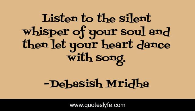 This page presents the quote "Listen to the silent whisper of your soul and then let your heart dance with song.". Author of this quote is Debasish Mridha. This quote is about debasish, silent-whisper, song, mridha, philosophy, debasish-mridha, soul, heart-dance, listen,.