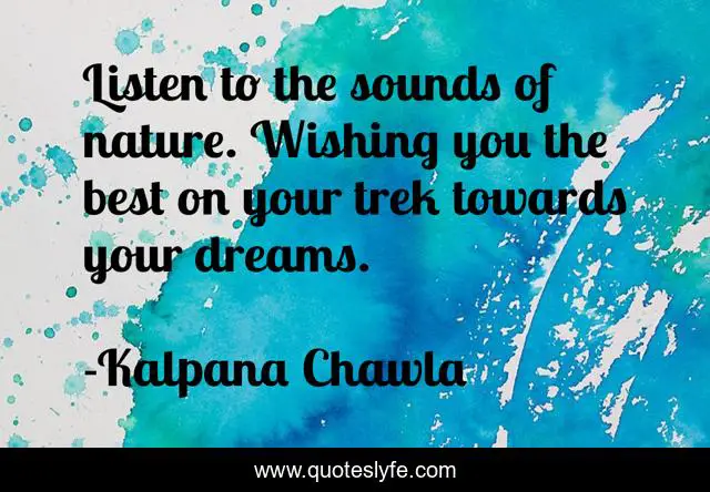 This page presents the quote "Listen to the sounds of nature. Wishing you the best on your trek towards your dreams.". Author of this quote is Kalpana Chawla. This quote is about your dreams, best, nature,.