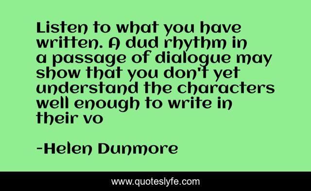 This page presents the quote "Listen to what you have written. A dud rhythm in a passage of dialogue may show that you don't yet understand the characters well enough to write in their vo". Author of this quote is Helen Dunmore. This quote is about dialogue, listening, insight, flow, writing, creative-process, characters, narrative,.