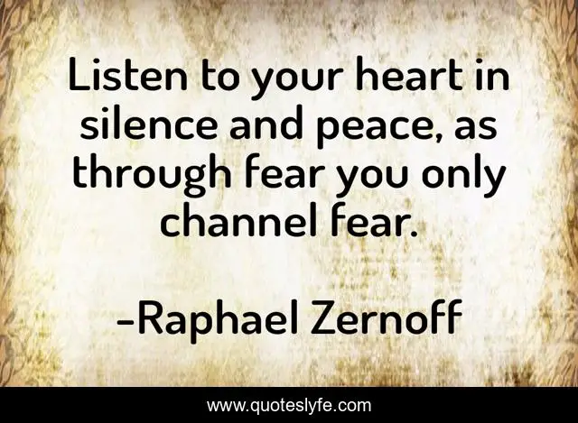 This page presents the quote "Listen to your heart in silence and peace, as through fear you only channel fear.". Author of this quote is Raphael Zernoff. This quote is about heart, channelling, self-awareness, peace, wisdom, awakening, raphael-zernoff, fear, silence,.