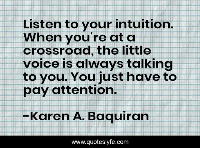 This page presents the quote "Listen to your intuition. When you're at a crossroad, the little voice is always talking to you. You just have to pay attention.". Author of this quote is Karen A. Baquiran. This quote is about intuition, loveyourself, love, light, peace, wisdom, voice, loveyourselfmovement, affection,.