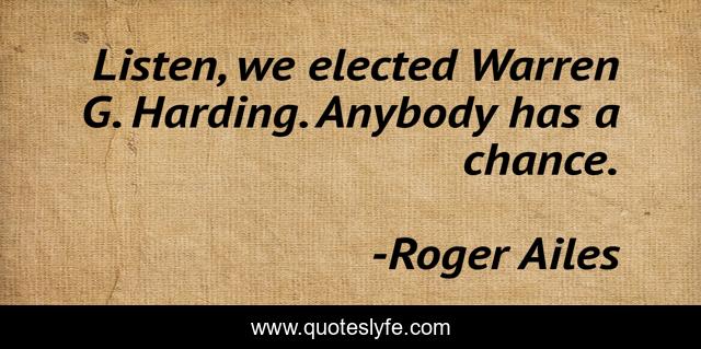This page presents the quote "Listen, we elected Warren G. Harding. Anybody has a chance.". Author of this quote is Roger Ailes. This quote is about elected, anybody, listen,.