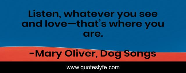 This page presents the quote "Listen, whatever you see and love—that’s where you are.". Author of this quote is Mary Oliver, Dog Songs. This quote is about home, love, affection,.