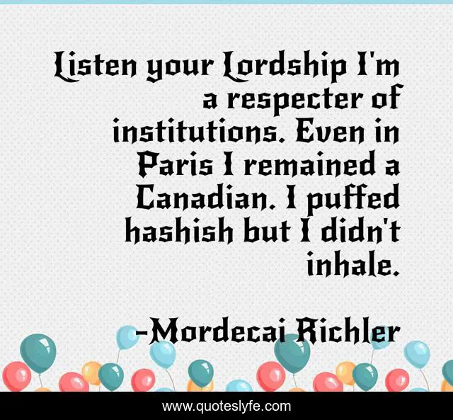 This page presents the quote "Listen your Lordship I'm a respecter of institutions. Even in Paris I remained a Canadian. I puffed hashish but I didn't inhale.". Author of this quote is Mordecai Richler. This quote is about canada, canadians,.