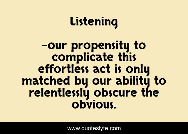 This page presents the quote "Listening". Author of this quote is our propensity to complicate this effortless act is only matched by our ability to relentlessly obscure the obvious.. .