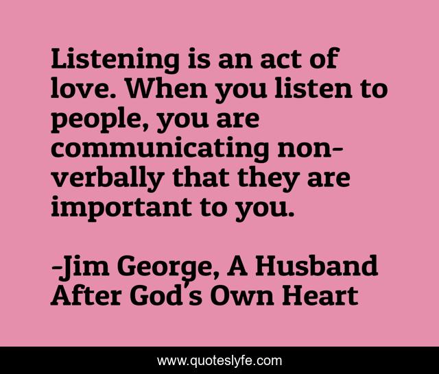 This page presents the quote "Listening is an act of love. When you listen to people, you are communicating non-verbally that they are important to you.". Author of this quote is Jim George, A Husband After God's Own Heart. This quote is about faith, christian, verbal, god, communicate, blessed, listening, act, love,.