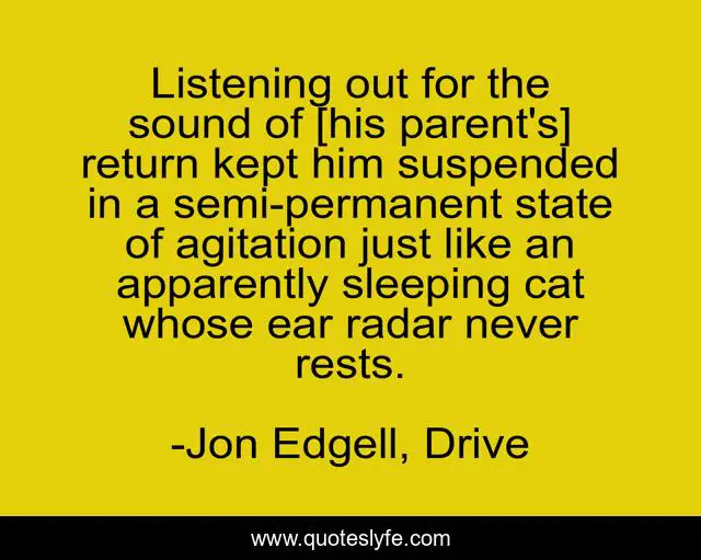 This page presents the quote "Listening out for the sound of [his parent's] return kept him suspended in a semi-permanent state of agitation just like an apparently sleeping cat whose ear radar never rests.". Author of this quote is Jon Edgell, Drive. This quote is about sleeping-cat, cats, agitation, listening, hearing,.
