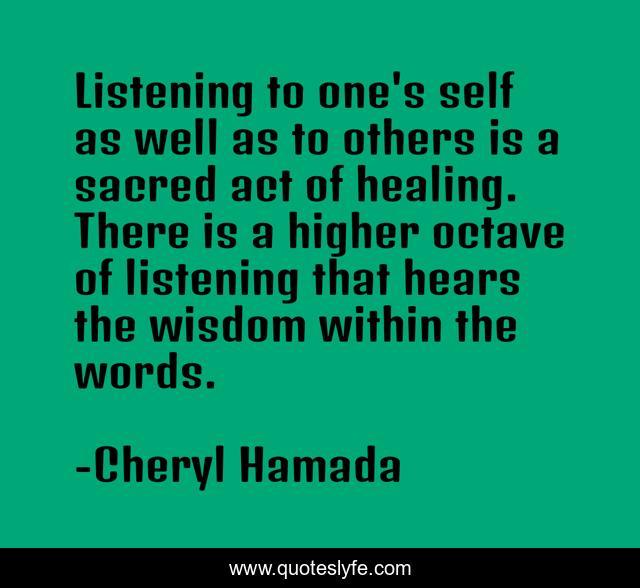 This page presents the quote "Listening to one's self as well as to others is a sacred act of healing. There is a higher octave of listening that hears the wisdom within the words.". Author of this quote is Cheryl Hamada. This quote is about inner-wisdom, healing, inspiration,.
