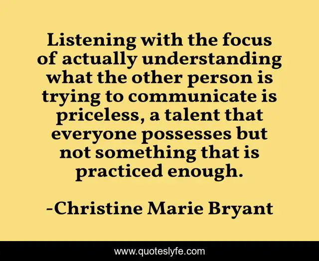This page presents the quote "Listening with the focus of actually understanding what the other person is trying to communicate is priceless, a talent that everyone possesses but not something that is practiced enough.". Author of this quote is Christine Marie Bryant. This quote is about talent, inspirational, communicate, understanding, listening, priceless, enthusiasm,.