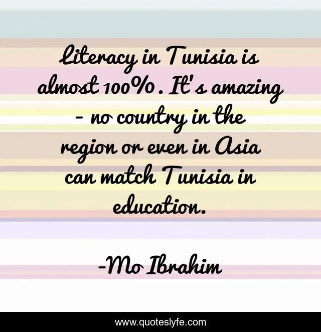 This page presents the quote "Literacy in Tunisia is almost 100%. It's amazing - no country in the region or even in Asia can match Tunisia in education.". Author of this quote is Mo Ibrahim. This quote is about country, education, literacy,.