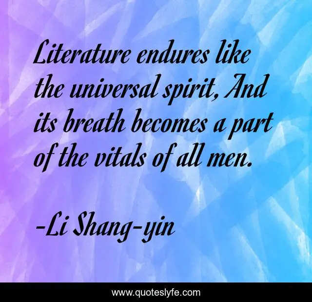 This page presents the quote "Literature endures like the universal spirit, And its breath becomes a part of the vitals of all men.". Author of this quote is Li Shang-yin. This quote is about breath, universal, literature, spirit, vitals,.
