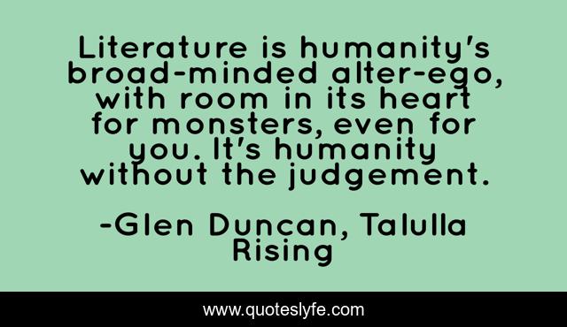 This page presents the quote "Literature is humanity's broad-minded alter-ego, with room in its heart for monsters, even for you. It's humanity without the judgement.". Author of this quote is Glen Duncan, Talulla Rising. This quote is about judgement, books, humanity, literature,.
