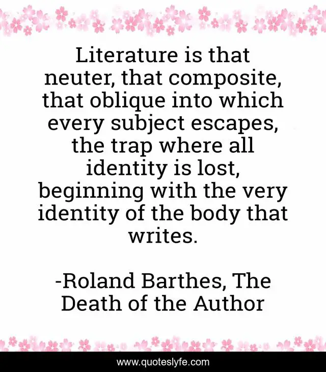 "Roland Barthes, The Death of the Author Quotes." Quoteslyfe.com, 2025. Sat. 06 Dec. 2025. <https://www.quoteslyfe.com/quote/Literature-is-that-neuter-that-composite-that-112189>.