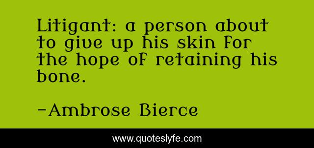 This page presents the quote "Litigant: a person about to give up his skin for the hope of retaining his bone.". Author of this quote is Ambrose Bierce. This quote is about law, lawyers,.