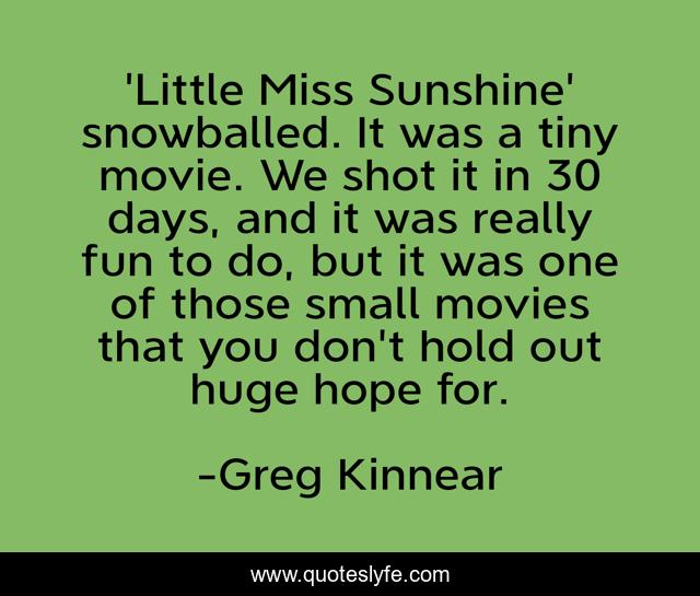 This page presents the quote "'Little Miss Sunshine' snowballed. It was a tiny movie. We shot it in 30 days, and it was really fun to do, but it was one of those small movies that you don't hold out huge hope for.". Author of this quote is Greg Kinnear. This quote is about fun, sunshine, hope,.