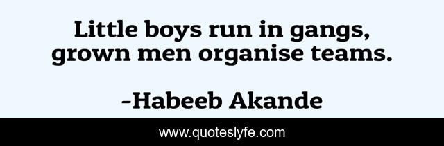This page presents the quote "Little boys run in gangs, grown men organise teams.". Author of this quote is Habeeb Akande. This quote is about boys, men, gang, teams,.